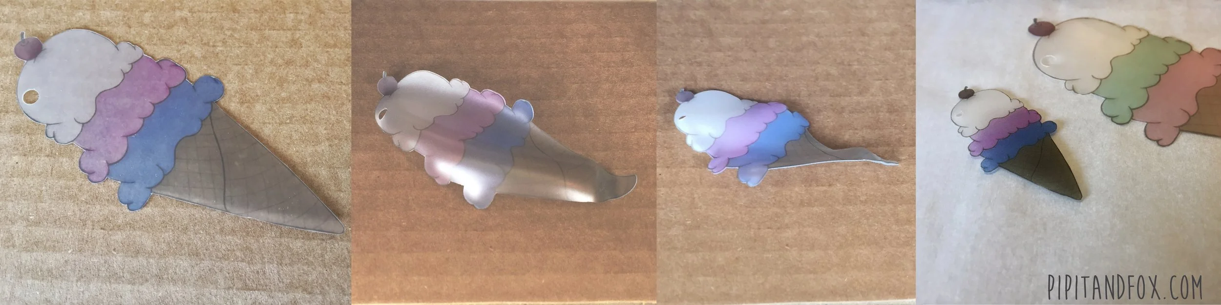 I recommend shrinking 1 piece at a time to start with, then as you get the hang of things, you can try your hand at more at the same time. I like to place my pieces on a sheet of cardboard (on a cookie sheet if using a standard oven). I also like to have a cutting board covered with a sheet of parchment paper standing by to place the pieces on when they come out of the oven. The shrink film will have specific directions for temperature and time, so of course follow that, but the key is to wait for the shrinking to stop, then count till 10. Then, and only then, carefully (using tongs and proper hot pads) pull the plastic out of the oven. If the plastic is still a little wrinkled, then smash it with a spatula as soon as you pull it out of the oven. I also used a layer of parchment paper between the plastic and the spatula, just to be safe.