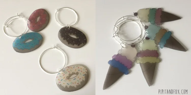 These bright and colorful DIY wine charms are a fun way to keep track of your guests' wine glasses at your next party and they make a great hostess gift! Even better, they are super easy and quick to make even if you have never heard of shrink plastic. Shrink plastic - what's that? It is a neat little sheet of plastic (some printable like this one) that you draw or print a design on, cut out, then shrink in an oven. Just like that, you have a custom OOAK durable little charm.